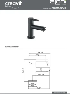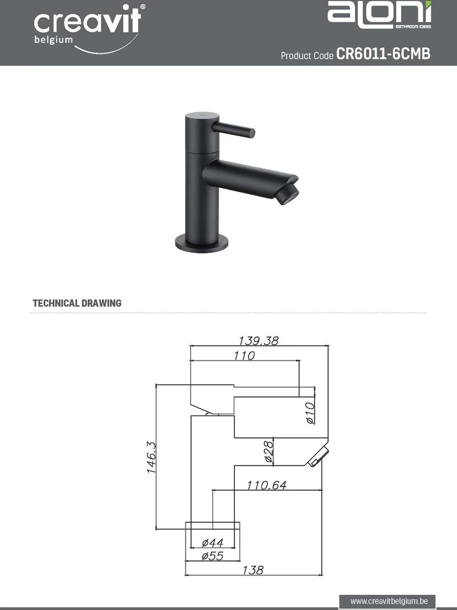 Aloni Design Koudwaterkraan 1/2 Mat Zwart – let op maximale fonteindikte 25 mm !