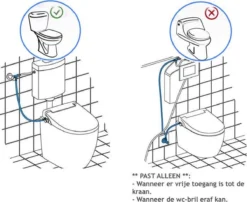 Past op de meest gebruikte staande wc’s, op zwevende en ingebouwde wc’s alleen pasbaar wanneer de wc-bril te demonteren is en er vrije toegang is tot de kraan.