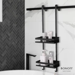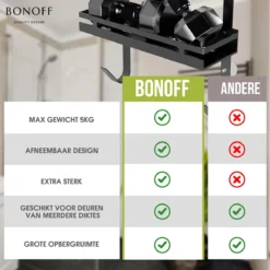 Bonoff 2 Laags Doucherek , makkelijk op te hangen zonder te boren, voor het opbergen van shampoo, douchegel, facewash of douchespons. Door de twee ruime lagen kun je hier al je douchespullen kwijt. Tevens kun je extra spullen ophangen aan de 2 handige haken aan de onderkant van dit mooie doucherek.