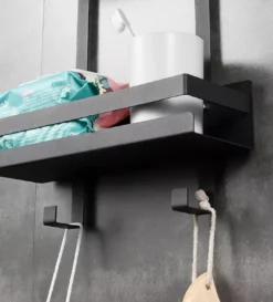 - Roest is geen partij – Het zwarte doucherek is van Rvs en is waterafstotend. Het is gemakkelijk schoon te spoelen, vanwege de open zijkanten. De doucheproducten blijven wel op hun plek door de extra rand.