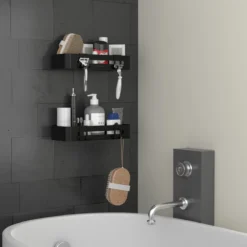 Het tweedelige doucherekje is groot genoeg voor alle douchespullen van jou en je partner, of zelfs het hele gezin. Dankzij de speciale haken zijn rondslingerende scheermesjes en sponzen voorgoed verleden tijd.