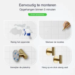 Handdoeken, theedoeken, vaatdoeken, als je ze gebruikt moeten ze droog en schoon zijn. Met deze handige ophanghaken, die je dankzij de sterke plakstrip makkelijk op een muur of kastje kunt plakken, heb je altijd een plekje om je doeken op te hangen. De zelfklevende haakjes zijn gemaakt van RVS, goud van kleur en eenvoudig te monteren. Je hoeft er namelijk niet voor te boren. Een must have voor je badkamer of keuken.