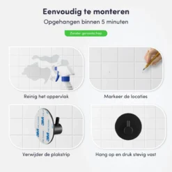 Het monteren van de haakjes is echt super simpel. Je hoeft er gelukkig niet voor te boren, want aan de achterzijde bevattende haakjes een krachtige plakstrip. Met deze plakstrip kun je de haakjes op ieder plek met voldoende vlak oppervlakte plakken en heb je de montage in een handomdraai gepiept.