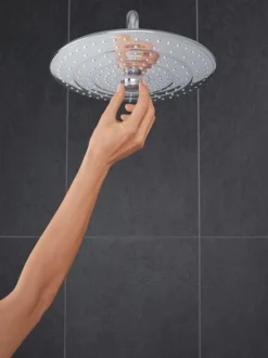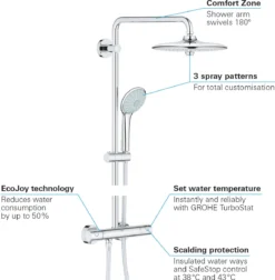 De gewenste temperatuur stel je gemakkelijk in met GROHE TurboStat. Het water blijft hierdoor op temperatuur, ook als de watertoevoer schommelt. De eenvoudige SafeStop knop beperkt de temperatuur tot maximaal 38˚C – ideaal als je kinderen alleen douchen – maar dit kan hoger gezet worden voor volwassenen. Dankzij de GROHE EcoJoy wordt het waterverbruik beperkt tot 9,5 l/min, maar is een complete douche-ervaring wel gegarandeerd.