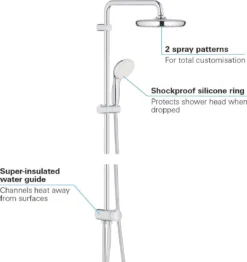 De handige siliconen SpeedClean sproeigaatjes kunnen eenvoudig vrij gehouden worden van vuil en kalk! De duurzame, glanzende GROHE StarLight chroomlaag gaat jarenlang mee en de InnerWater Guide voorkomt dat het oppervlak van de douche te warm wordt. Zo bescherm je jouw huid en de schitterende chroom afwerking. De handdouche heeft een stijlvolle, chique witte sproeiplaat en een ShockProof siliconen ring die beschadiging voorkomt als de handdouche uit je handen valt. Het systeem wordt geleverd met twee Relexaflex doucheslangen, beide met een soepel AntiScratch oppervlak voor een eenvoudige reiniging. De 1250 mm doucheslang sluit je aan op de kraan en de 1500 mm slang op de handdouche.