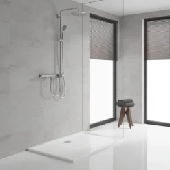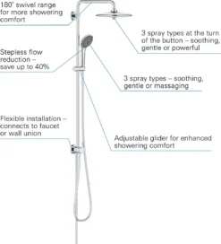 Met het indrukwekkende douchesysteem met omstelling voeg je meteen design en een aangename douchebeleving toe aan een moderne badkamer. Dit systeem is perfect als je snel je badkamer wilt opknappen omdat je je huidige douchekraan kunt gebruiken. Je hebt dit systeem dus in een handomdraai geïnstalleerd. Dit systeem is geproduceerd in Duitsland en uitgerust met de geavanceerde technologie van GROHE. Hiermee ben je dus verzekerd van topprestaties. GROHE EcoJoy beperkt het waterverbruik tot 9,5 l/min maar je bent wel verzekerd van een complete douche-ervaring. De GROHE DreamSpray verdeelt het water gelijkmatig over alle sproeigaatjes.