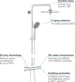 Met het GROHE Vitalio Joy 260 douchesysteem met thermostaatkraan voeg je meteen design en een aangename douchebeleving toe aan je badkamer. Dit systeem is ook uitgerust met de geavanceerde technologie van GROHE. Hiermee ben je verzekerd van topprestaties. Stel je gewenste temperatuur in met GROHE TurboStat en het water blijft op temperatuur, ook als de watertoevoer schommelt. De eenvoudige SafeStop knop beperkt de temperatuur tot maximaal 38˚C – ideaal als je kinderen alleen douchen – maar dit kan hoger gezet worden voor volwassenen.