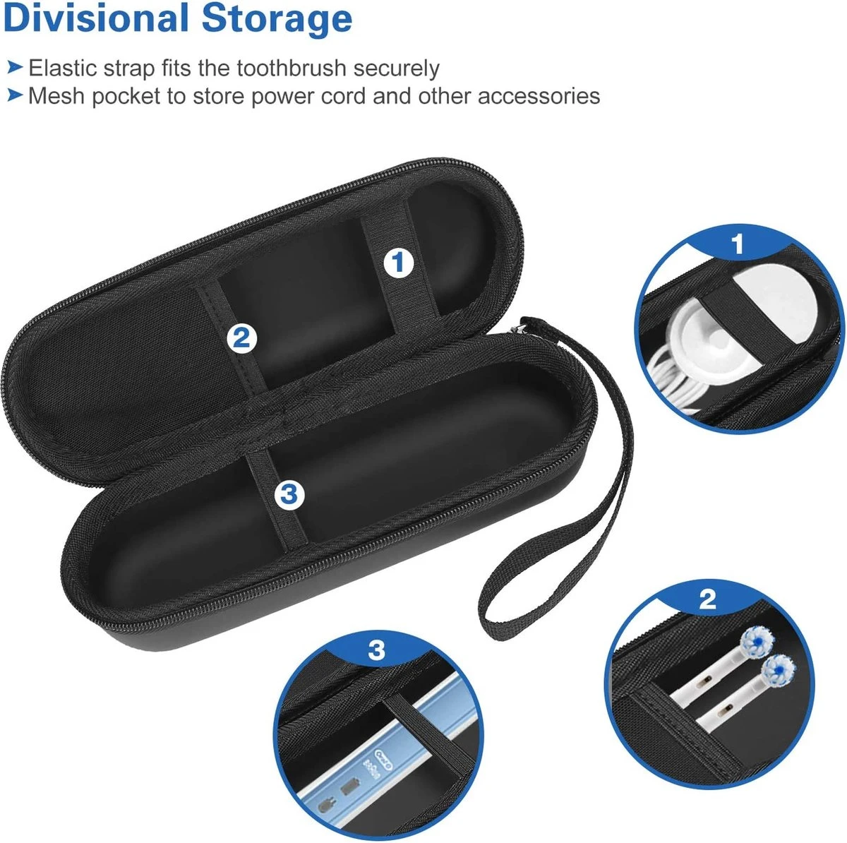 - Het hoofdvak met elastiek past veilig in je elektrische tandenborstel; het extra netvak biedt flexibiliteit voor het opbergen van netsnoeren, borstelkoppen, tandpasta en andere accessoires