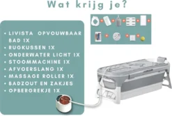 Het bad is binnen enkele minuten opgezet doormiddel van de biijgestuurde handleiding. Vervolgens kan het gevuld worden met warm of koud water. Het water blijft extra lang warm door het afneembare dek. Ook is dit bad voorzien van enorm veel accessoires, zoals: