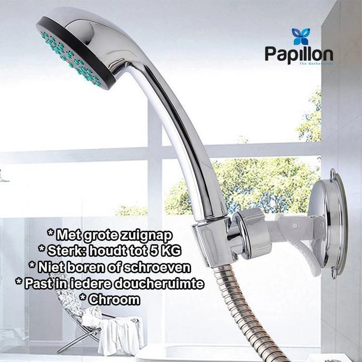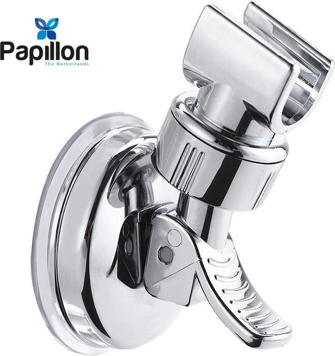 De meest gebruiksvriendelijke klik&vast Papillon douchekophouder in Chroom! Nu met verbeterde zuignap