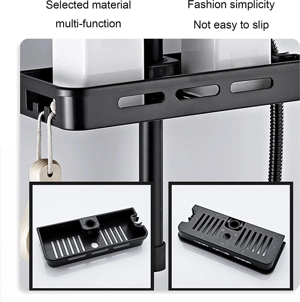 - Eenvoudige installatie: snelle en eenvoudige installatie zonder boren. De afneembare bodemplaat helpt om het droog en schoon te houden. Door de verstelbare klem voor iedere douchestang geschikt.