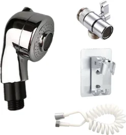 - Draagbare douchestandaard: gratis standaard beschikbaar. De beugel die op de toilettank is geïnstalleerd, kan worden gesplitst als een wanddouchebeugel. De standaard past zich aan bijna alle handsproeiers, bidets of douchekoppen aan.