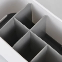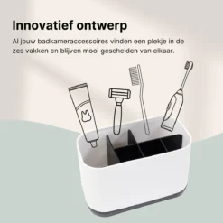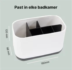 Met zijn stijlvolle ontwerp, past onze tandenborstelhouder met verschillende vakken perfect in elke badkamerstijl. Het ontwerp is compact en plaatsbesparend, zodat u de bak overal kunt gebruiken, zelfs in de kleinste badkamers.