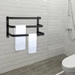 Het luxe handdoekrek van Qualux® is ultiem veelzijdig en superhandig. Je monteert het stijlvolle zwarte rek met de bijgeleverde montagematerialen in een handomdraai op je muur, deur of kast en vervolgens hang je er alles aan wat je maar wilt – Bijvoorbeeld de bijgeleverde luxe handdoek! Dit luxe handdoekrek is werkelijk geschikt voor elke badkamer. Met zijn drie stangen om handdoeken op te hangen is dit rek zelfs geschikt voor gezinnen. Verrassend genoeg heeft het rek ondanks de royale ophangruimte een ruimtebesparend ontwerp, zodat jij niet veel ruimte zal moeten inleveren in jouw badkamer. Het rek is verkregen uit kwalitatief hoogwaardige materialen, zodat het rek niet zal gaan roesten en zo een zeer lange levensduur heeft. Geniet eindeloos lang van dit handige handdoekrek!