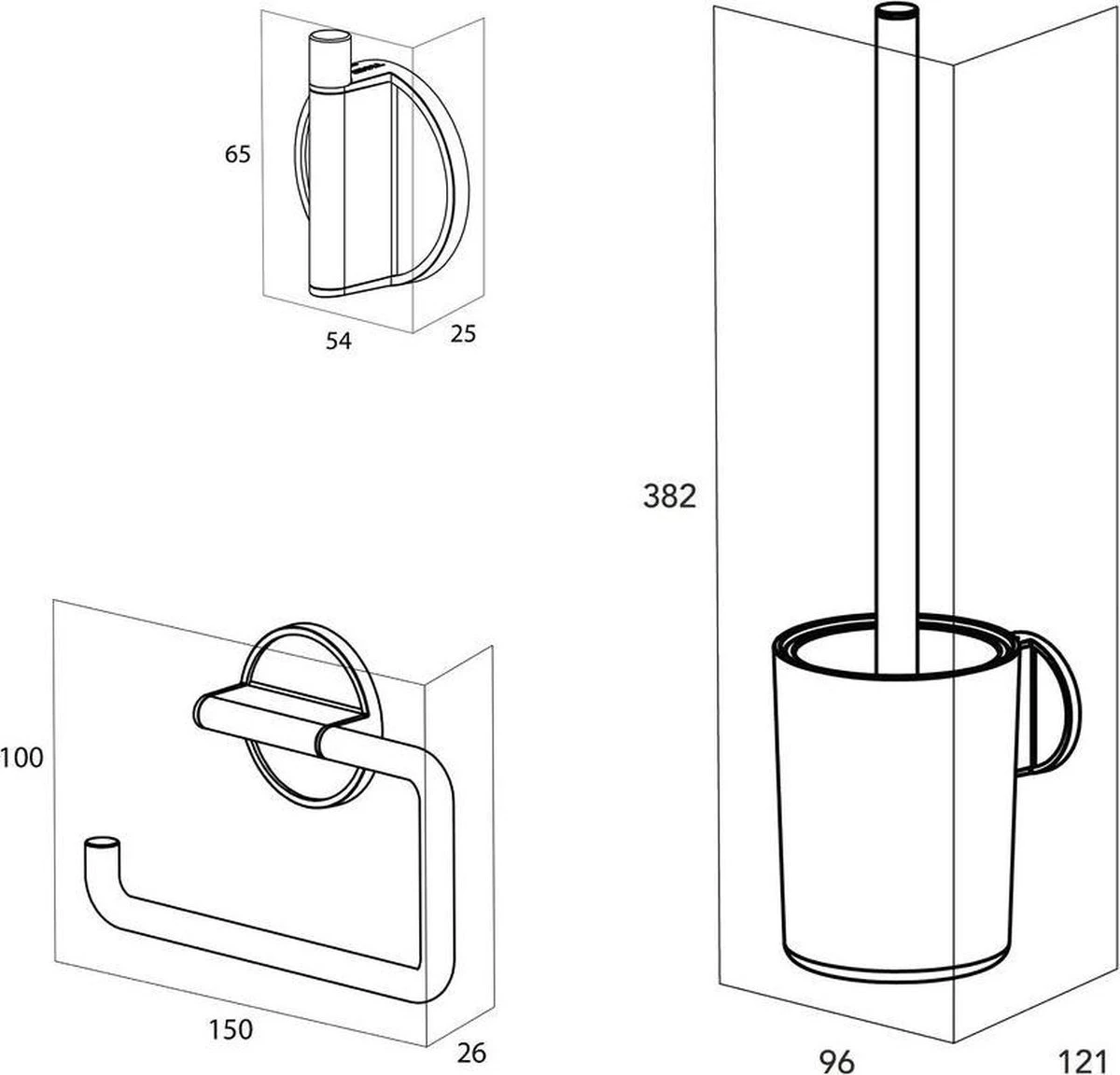 - Complete set: handdoekhaak, toiletrolhouder zonder klep en toiletborstelset