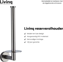 Op de LIVINQ reserverolhouder kunnen 2 toiletrollen geplaatst worden. De reserverolhouder is gemakkelijk te monteren door middel van de bijgeleverde schroeven. Doordat deze reserverolhouder bevestigd wordt aan de muur, kun je gemakkelijk de vloer dweilen zonder het artikel te moeten verplaatsen. De afmetingen zijn: 27 cm (hoogte) en 7,5 cm (breedte).