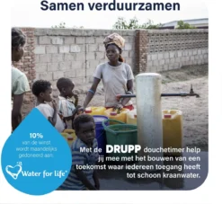 Met de Drupp douchetimer help je dus een extra handje. Niet alleen bespaar je op je eigen huishouden, ook ondersteun je wereldwijde toegang tot schoon kraanwater voor iedereen!