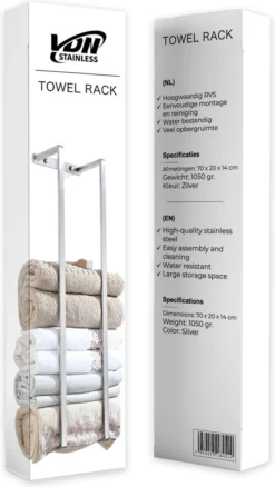 Het handdoekrek van VDN Stainless is uitgevoerd in roestvrijstaal en is geschikt voor tussen de 15 en 18 handdoeken! Het handdoekenrek kan eenvoudig aan de muur bevestigd worden zonder dat de bijgeleverde bevestigingsmaterialen zichtbaar zijn. De afmetingen van de handdoekhouder zijn: 70x20x14 cm.